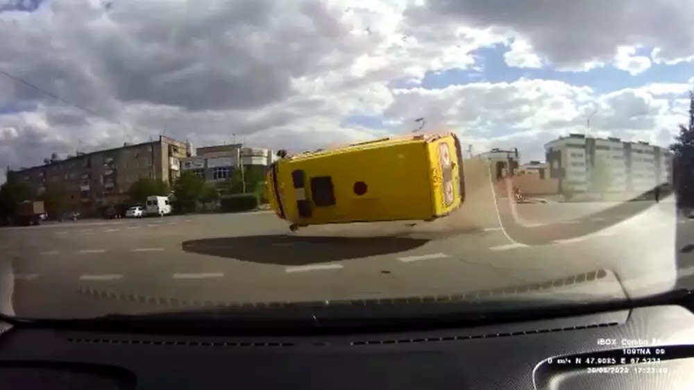 На кадрах запечатлено, как водитель службы скорой медицинской помощи на большой скорости пытается проехать перекресток и в него врезается Toyota Highlander. В результате столкновения спецтранспорт переворачивается и падает на бок.