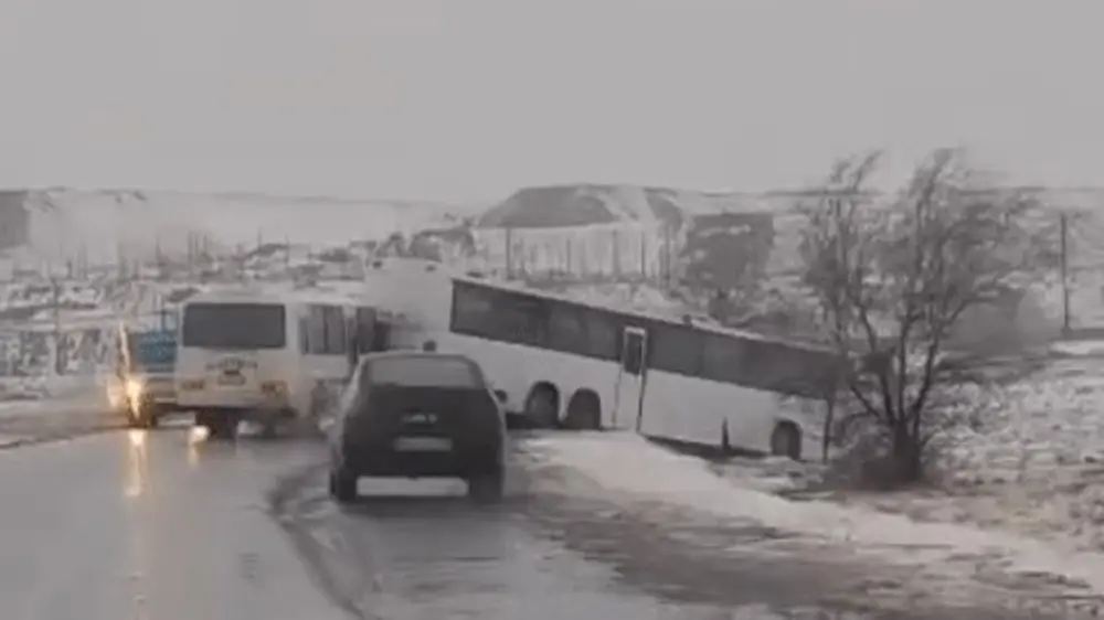 В Экибастузе три автобуса с рабочими съехали с трассы из-за гололеда, передает корреспондент Tengrinews.kz.