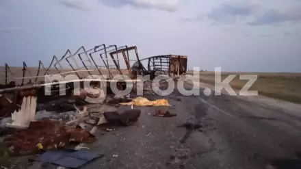 "После лобового столкновения КамАЗа с прицепом, груженным 40 лошадьми, и пустой фуры Mercedes-Benz Actros с турецкими номерами произошел пожар. Большегрузы были полностью уничтожены огнем, сгорело 39 голов лошадей. С автомашин были извлечены два обгоревших трупа, один человек с различными травмами госпитализирован в центральную районную больницу Сырымского района. Личности пострадавших устанавливаются", - пояснили в пресс-службе ведомства.