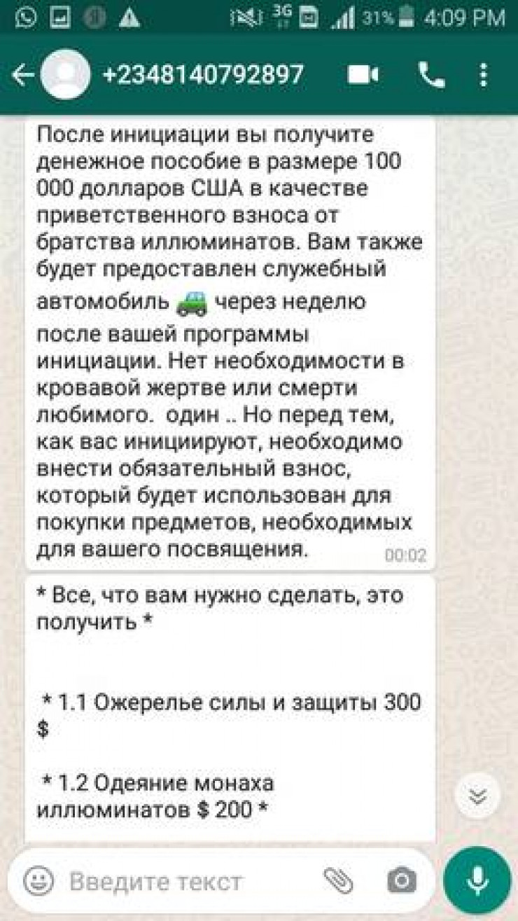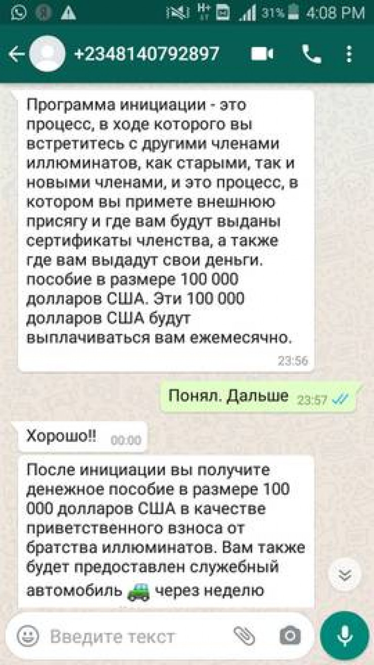 С Михаилом связался некий Мэтт Дарлингс, который, по его словам, является полноправным членом клуба иллюминатов. Он якобы помогает заинтересованным людям стать богатыми и известными.
