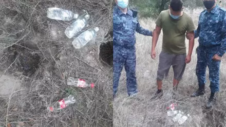 На территории учреждения ЛА-155/14 департамента УИС Алматинской области замечен и задержан гражданин, возле которого были обнаружены пластиковые бутылки емкостью 0,5 литра, обмотанные скотчем, с неизвестной прозрачной жидкостью, которые он собирался перебросить на территорию учреждения.