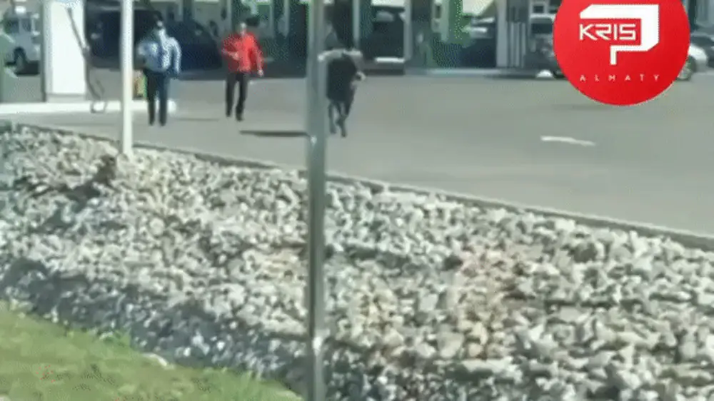 На кадрах видно, как мужчина и страж порядка бегут за животным. Необычная погоня происходит недалеко от заправки.