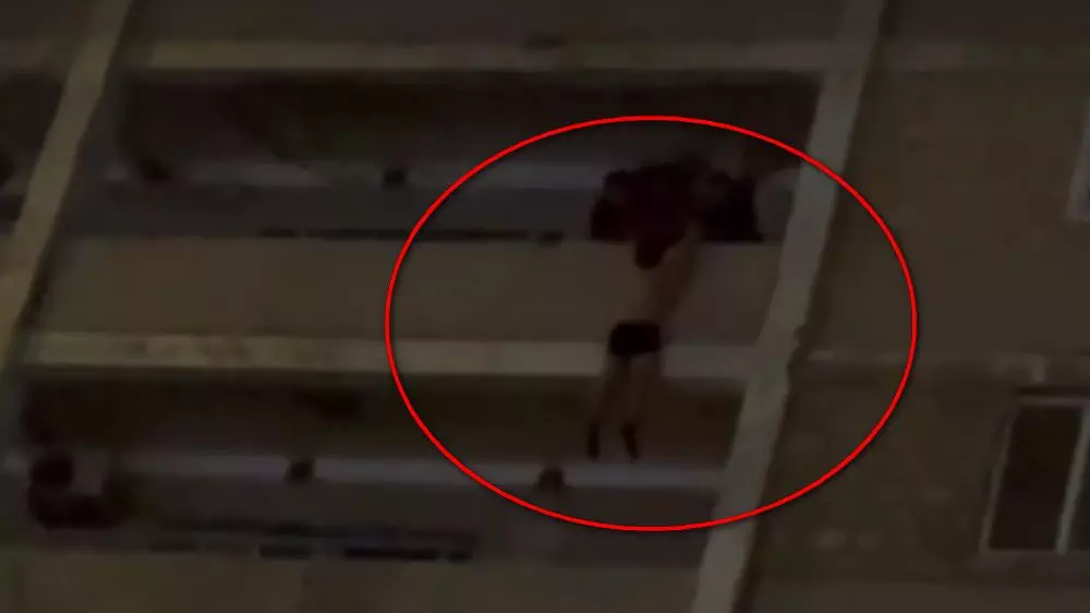 Повисшего на высоте 8-го этажа мужчину в нижнем белье затащили на балкон в Актау Кадр из видео с сайта lada.kz
