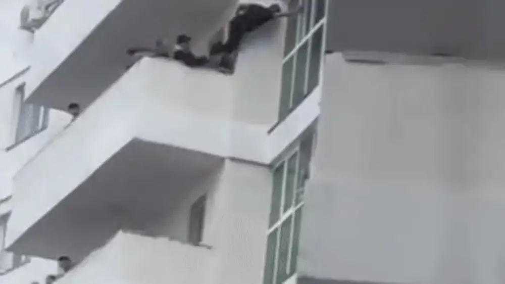 На кадрах видно, как женщина босиком стоит с обратной стороны балкона на 7-м этаже. В этот момент из окна квартиры этажом ниже вылезает мужчина, как позже выяснилось, водитель пожарной машины, и перехватывает ее за ногу. Другой пожарный, который находится в горящей квартире, берет ее за руки и передает коллеге снизу.