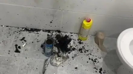На кадрах видны разбитые двери и стекла, а также черные пятна на стенах и потолке.