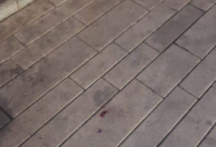 Недалеко от входа в здание видны бурые пятна, похожие на кровь.