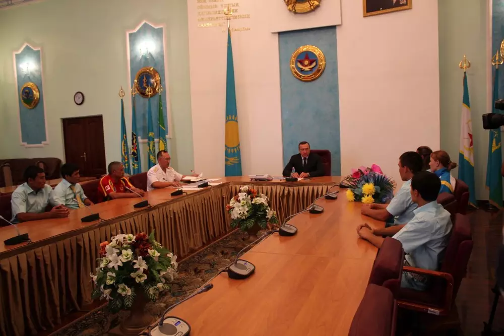 В министерство обороны пришли всего 7 олимпийцев, остальные находятся на сборах за пределами страны. Встреча с заместителем министра обороны Казахстана Сергеем Громовым получилась недолгой - всего несколько минут. По сути, это пожелание успехов, здоровья и везения.