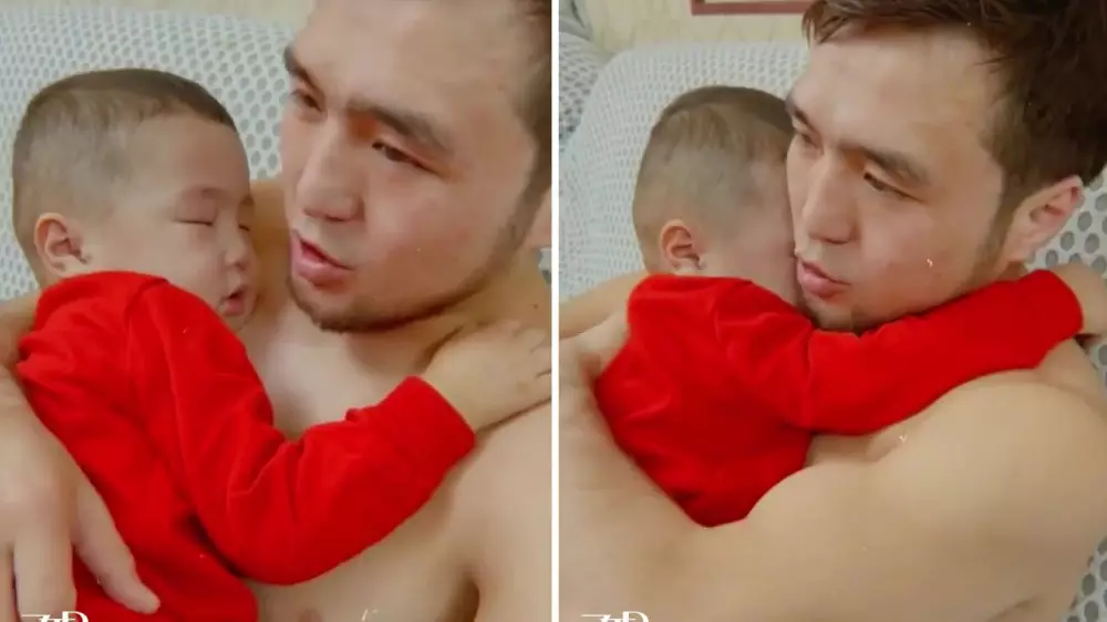 Роликтен дзюдошы кішкентай баласын қолында ұйықтатып, одан жарысқа баруға сұранып отырғанын көруге болады.