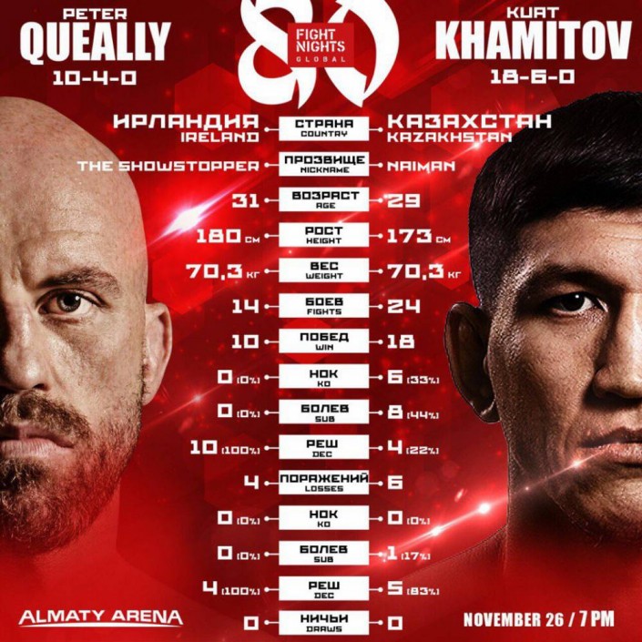 26 ноября на "Алматы Арене" пройдет грандиозное шоу - совместный турнир нового казахстанского промоушена AFC и российской компании Fight Nights. В главном бою вечера сойдутся Куат "Найман" Хамитов и Питер Куилли из Ирландии. Последний является крепким бойцом из ТОП-10, другом, одноклубником и спарринг-партнером мировой звезды ММА Конора МакГрегора, сообщает пресс-служба организаторов.