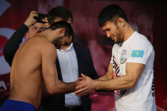 В субботу бойцы провели дуэль взглядов. Мероприятие прошло в дружелюбной обстановке и вызвало овации зрителей, сообщает спортивный портал Vesti.kz.