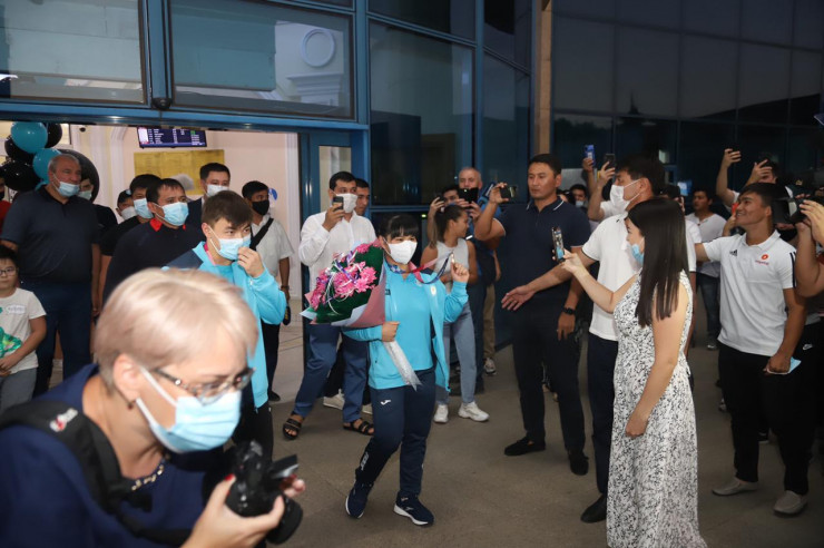 Тяжелоатлеты, бронзовые призеры Олимпиады-2020 в Токио Игорь Сон и Зульфия Чиншанло приземлились в аэропорту Алматы, передает корреспондент Tengrinews.kz.