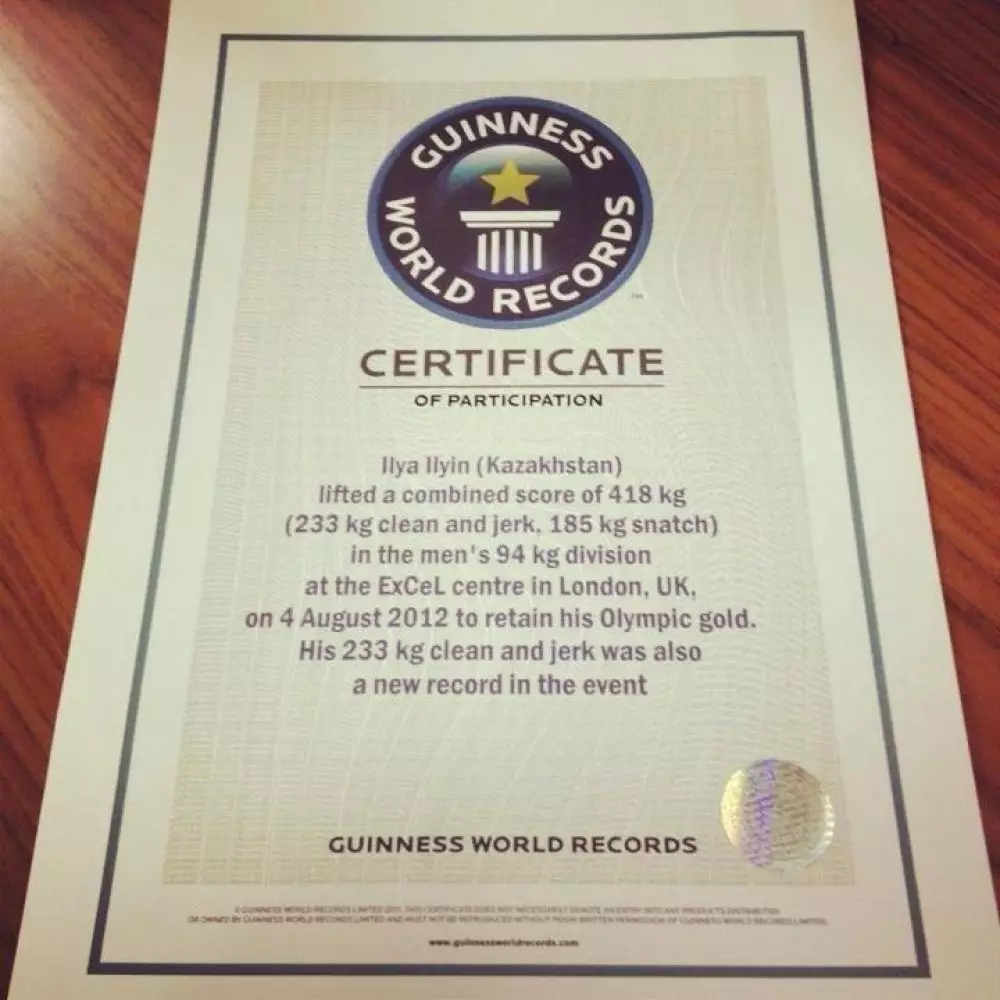 Казахстанский тяжелоатлет, двукратный олимпийский чемпион Илья Ильин получил сертификат Книги рекордов Гиннесса, передает корреспондент Twitter спортсмена. "Мой сертификат! Наконец-то я его добился! Спасибо всем людям Мира, которые верили в меня и шли со мной до конца!" - написал Ильин в своем Twitter. На летних Олимпийских играх 2012 года в Лондоне Ильин в "толчке" взял 233 килограмма, установив новый мировой рекорд. В сумме двух упражнений казахстанец набрал 418 килограммов, также обновив новый мировой рекорд. Таким образом, Ильин стал двукратным олимпийским чемпионом и принес Казахстану золото Олимпиады в Лондоне.