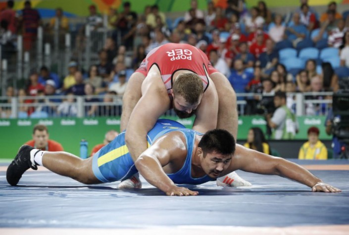Нурмахан Тыналиев (до 130 килограммов) в первом же раунде проиграл немцу Эдуарду Поппу. За всю схватку борцы на двоих сделали одно результативное действие, которые и вывело представителя Германии дальше.