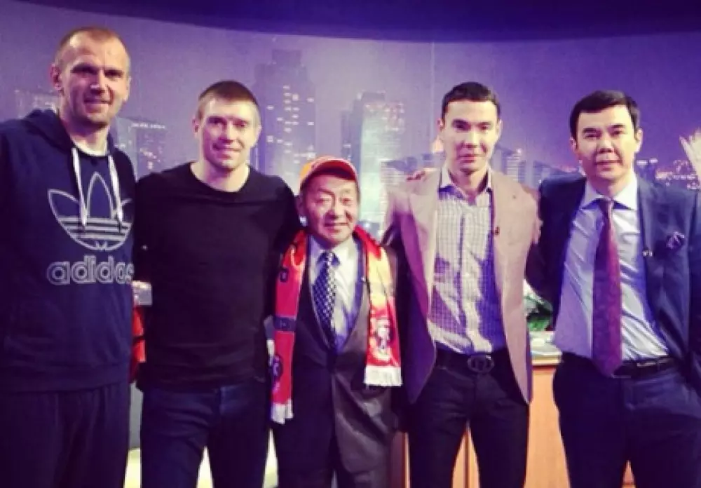Известный КВНщик пригласил в ТВ-шоу Головкина и Винокурова В студии у Нурлана Коянбаева (первый справа) футболисты Кайрат Нурдаулетов и Алдин Джидич. Фото ©Виталий Ли