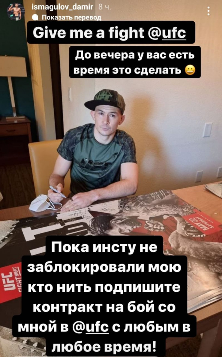 "Дайте мне бой, UFC. До вечера у вас есть время это сделать. Пока инсту не заблокировали мою, кто-нибудь подпишите контракт на бой со мной в UFC. С любым в любое время", - говорится в его сообщении.