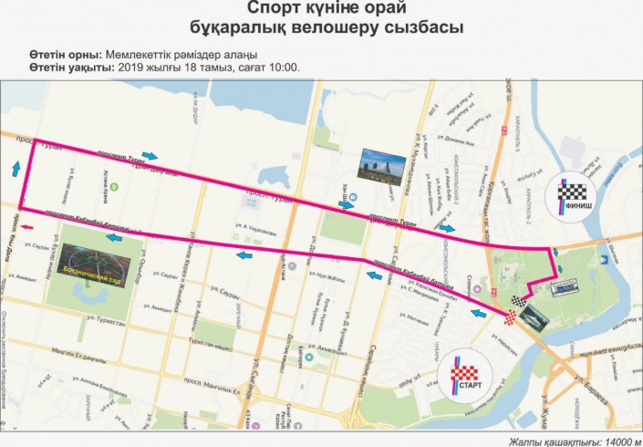 Для участия в любительском турнире необходимо наличие собственного велосипеда. Стоит отметить, что в период проведения велопробега, 18 августа с 10.00 до 11.30, будет частично ограничено движение автотранспорта по маршруту движения участников велопробега (то есть по проспекту Кабанбай батыра, улице Улы Дала и проспекту Туран). Организаторы просят автолюбителей заранее планировать маршрут с учетом перекрытия.