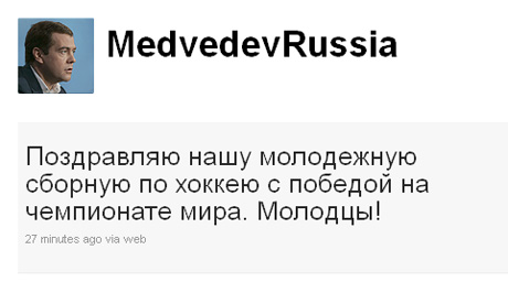 Президент России Дмитрий Медведев поздравил молодежную сборную России по хоккею с завоеванием титула чемпиона мира через свою официальную страницу на Twitter, передает корреспондент Tengrinews.kz. "Поздравляю нашу молодежную сборную по хоккею с победой на чемпионате мира. Молодцы!", - написал Медведев. Тем временем, РИА Новости сообщает, что премьер-министр РФ Владимир Путин направил поздравительную телеграмму молодежной сборной. Как отметили в пресс-службе правительства России, "Путин дал высокую оценку поистине профессиональной игре молодых российских хоккеистов, которая порадовала многие миллионы болельщиков не только в России, но и во всем мире". Отметим, 6 января молодежная сборная России по хоккею завоевала звание чемпиона мира 2011 года, прошедшего в городе Баффало в США. Россияне победили со счетом 5:3, несмотря на то, что после двух периодов уступала своим соперникам со счетом 0:3. В итоге россияне на последних минутах сумели забросить пять шайб в ворота канадцев.