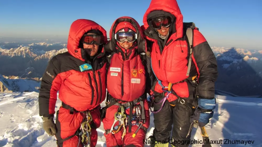 Международная экспедиция взошла на пик К2 Максут Жумаев, Герлинда Кальтенбруннер и Василий Пивцов на вершине. ©National Geographic\Maxut Zhumayev