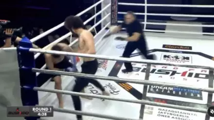 Поединок продлился всего 20 секунд и закончился яркой досрочной победой Тажиева техническим нокаутом. Сначала он нанес мощный удар коленом в прыжке, а затем устроил Калиеву добивание с обеих рук на канатах.