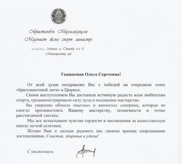 Министр культуры и спорта Арыстанбек Мухамедиулы поздравил Ольгу Рыпакову с победой. "Мы все испытываем чувство гордости и восхищения за казахстанскую школу легкой атлетики", - отметил он.