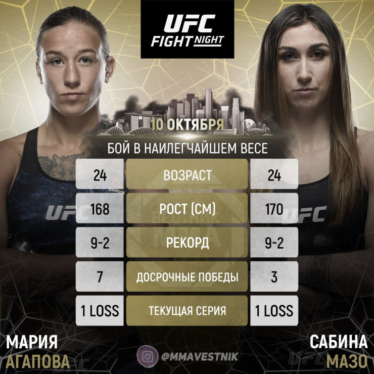 Для Агаповой это будет третий бой под эгидой мирового промоушена. Она не выходила в клетку с августа 2020 года, когда проиграла техническим нокаутом американке Шане Добсон. Дебют же в UFC у нее состоялся за два месяца до этого с досрочной победы над американкой Ханной Сайферс.