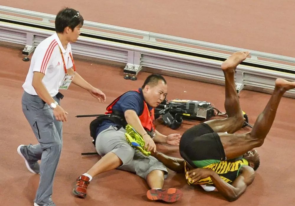 После победы в забеге на 200 метров Болт шел по беговой дорожке стадиона, за ним ехал оператор на сегвее. Потеряв управление самокатом, журналист упал и сбил спортсмена с ног.