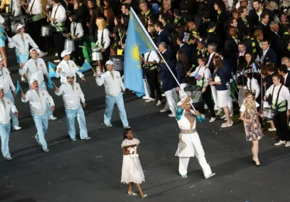 Нурмахан Тыналиев и казахстанские олимпийцы в парадной форме на церемонии открытия Олимпиады в Лондоне в 2012 году.