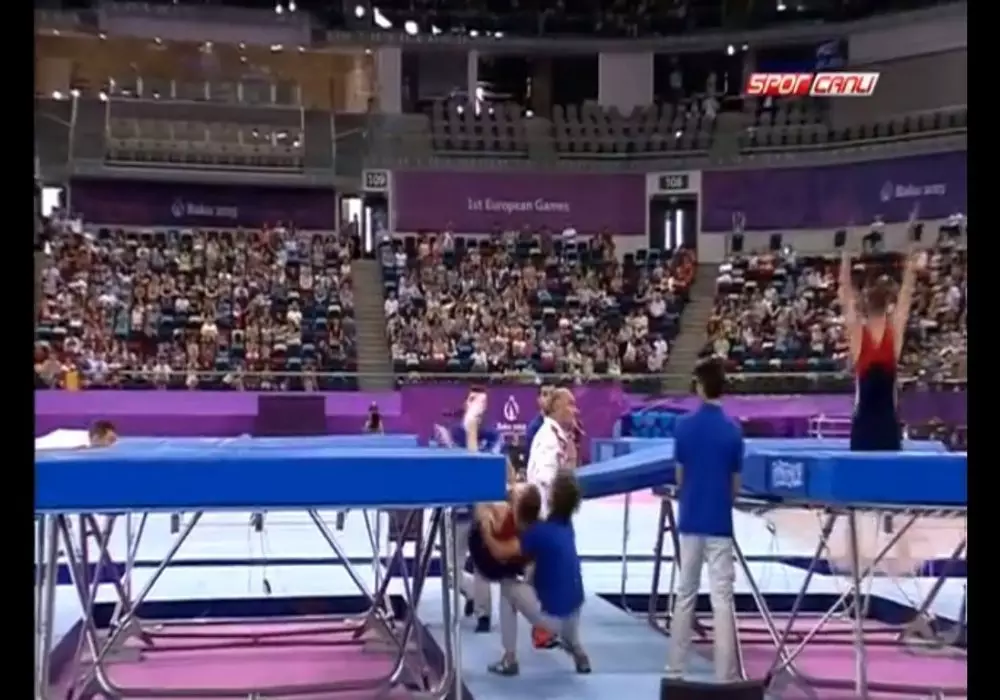 На соревнованиях по прыжкам на батуте в рамках первых Европейских игр в Баку волонтер спас польского гимнаста, прыгнувшего мимо батута, сообщает Trend.