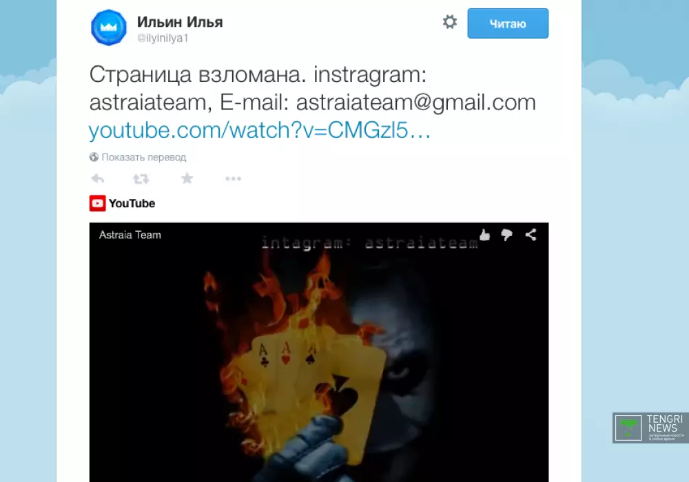Сегодня, 20 июня, в официальном аккаунте спортсмена появилось странное сообщение о том, что страница взломана. Неизвестные под ником Astraia Team оставили видеоролик на его странице. На ролике можно услышать мужской голос: "Да, Илья взломан. Мы это делаем на заказ. Дорого, качественно, анонимно. Алга, Казахстан!".