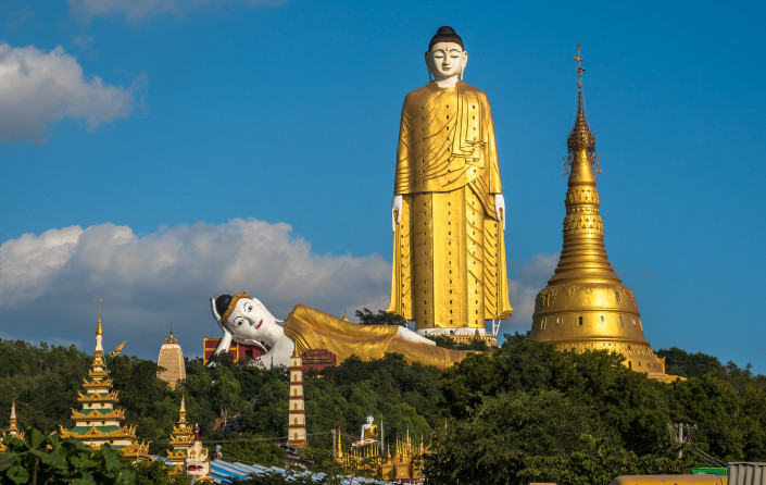 Лечжун-Сасачжа - статуя Будды, Кхатакан-Таунг, Мьянма. Общая высота статуи вместе с постаментом - 129,24 метра. Она посвящена Будд и представляет собой изображение Шакьямуни - духовного учителя, которого и считают основателем буддизма. Недалеко от нее расположилась еще одна статуя - лежачего Будды. Интересным фактом является то, что лежачий Будда появился здесь на 17 лет раньше стоящего Будды.