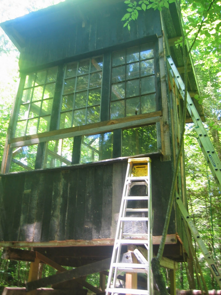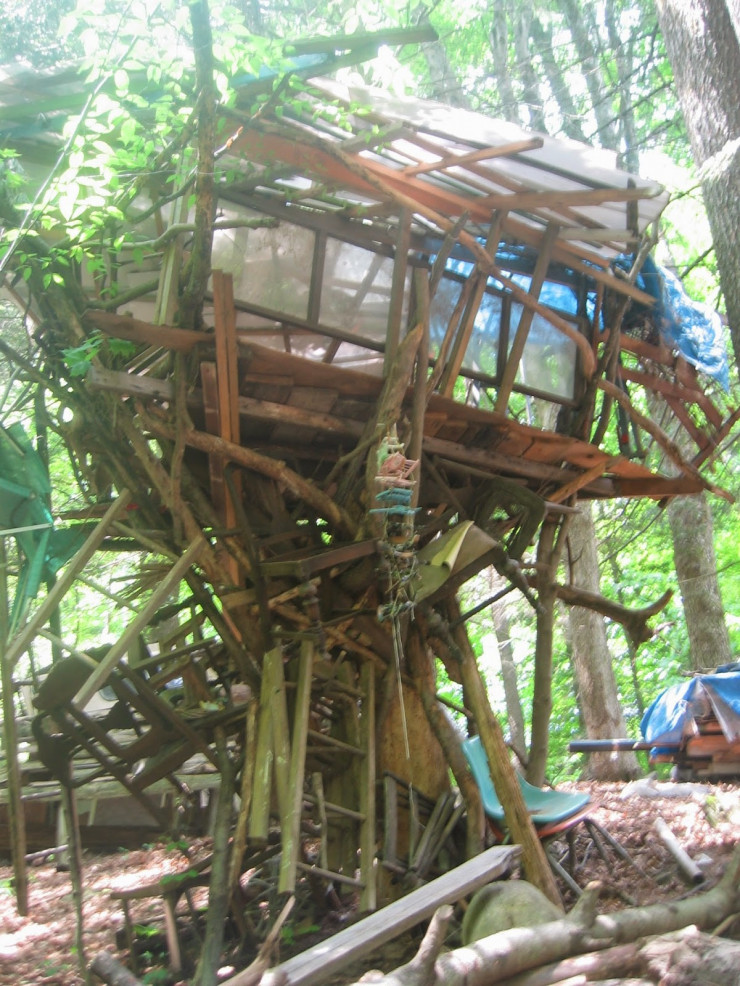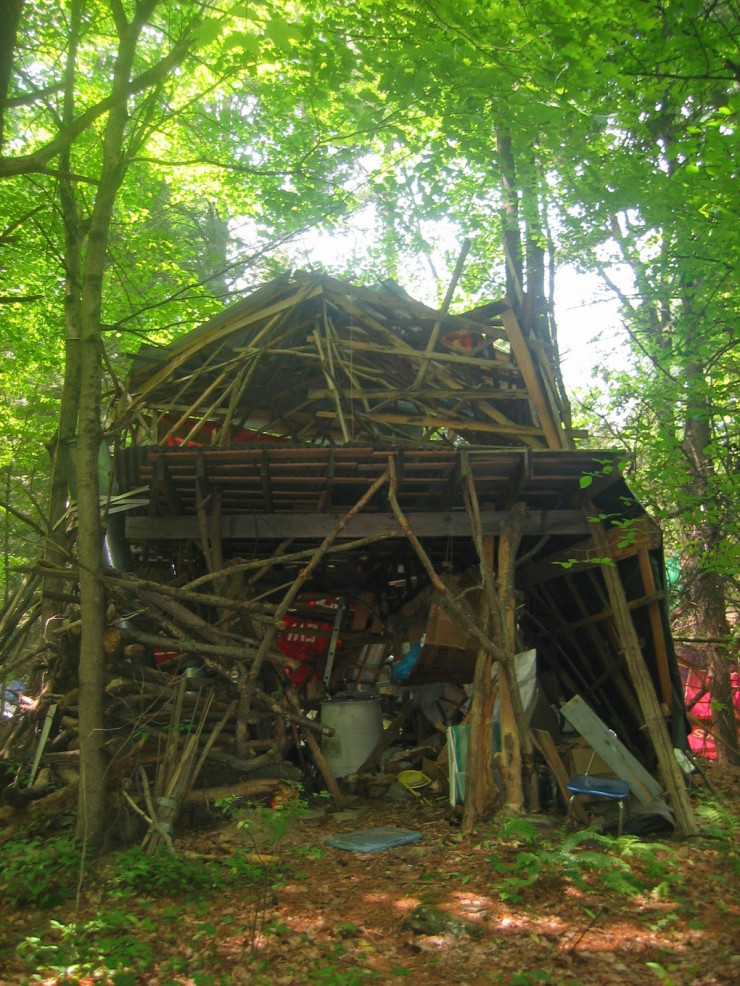 Среди построек есть башня с виниловыми пластинками вместо черепицы, фигура медведя из колючей проволоки и бункер из наполненных грязью мешков под названием "Дом цикады" и классический А-образный дом. В "городе" также имеются деревянные мосты, лестницы и собственная церковь в стиле Тюдор со скамьями и витражами, которые были подарены Мэтту доброжелателями.