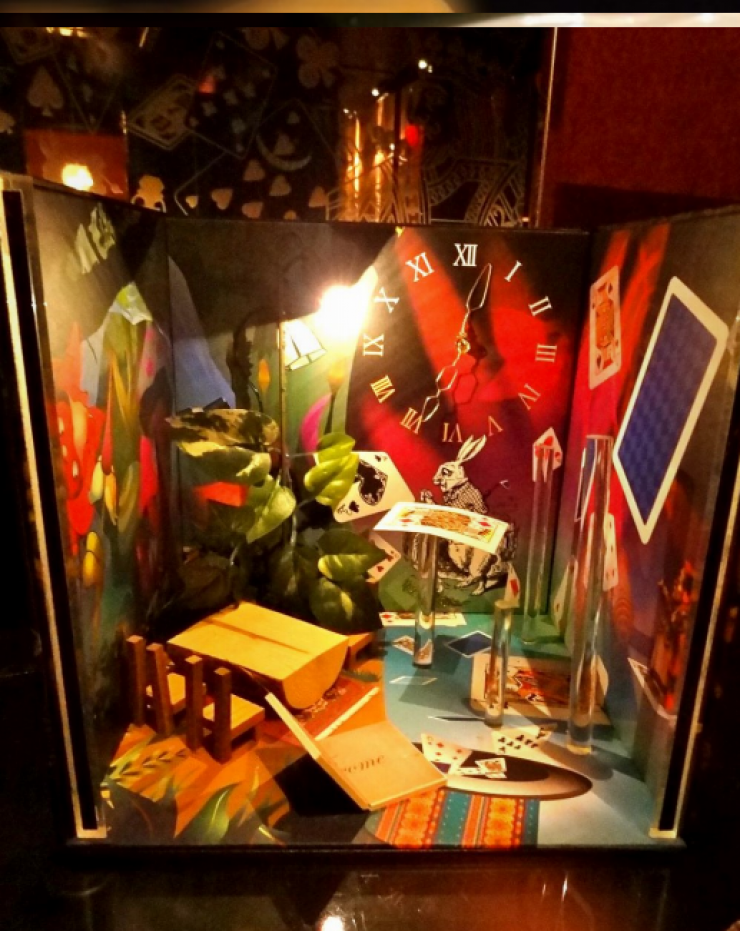 В Токио есть кафе, декорированное в стиле "Алисы в стране чудес". Потолки заведения украшены изображениями игральных карт, есть уголок с белым кроликом в саду. Alice in a labyrinth пользуется большой популярностью у местных жителей и туристов.