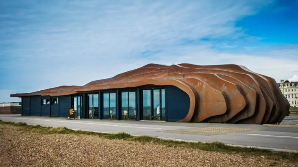 Томас Хезервик, автор пляжного кафе из железных листов, создал это заведение в Литтл-Хэмптоне. Владельцы кафе East Beach Cafe собирались спроектировать здание, которое было бы длинным и низким, что максимально увеличит возможность наблюдать за потрясающими видами на океан прямо из окна.