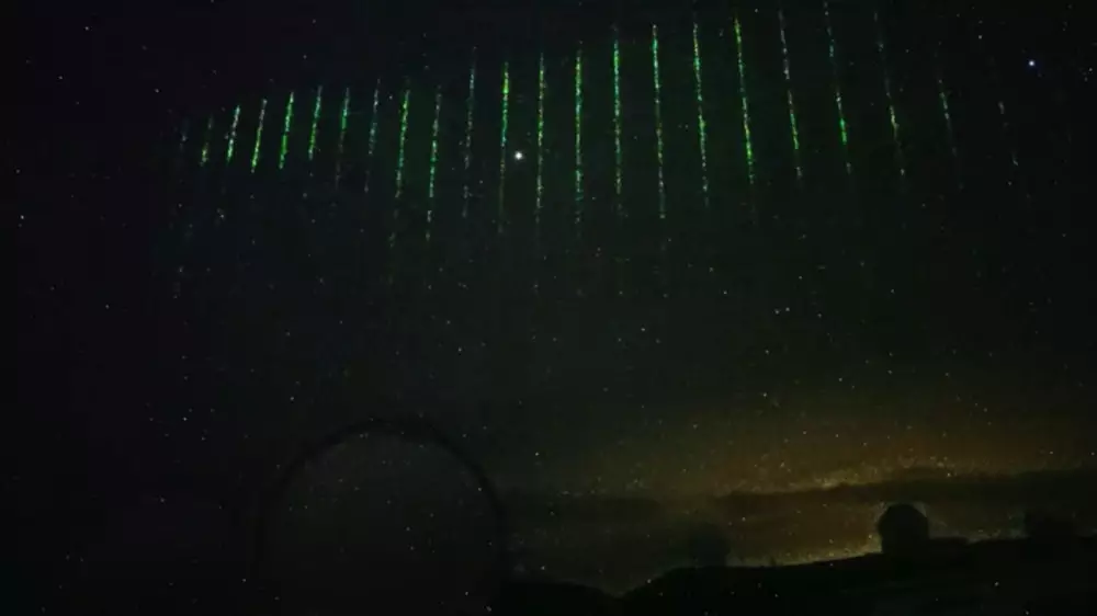 Серия зеленых лазерных лучей попала в объектив камеры телескопа "Субару", который принадлежит Национальной астрономической обсерватории Японии и находится на вершине потухшего вулкана Мауна-Кеа.