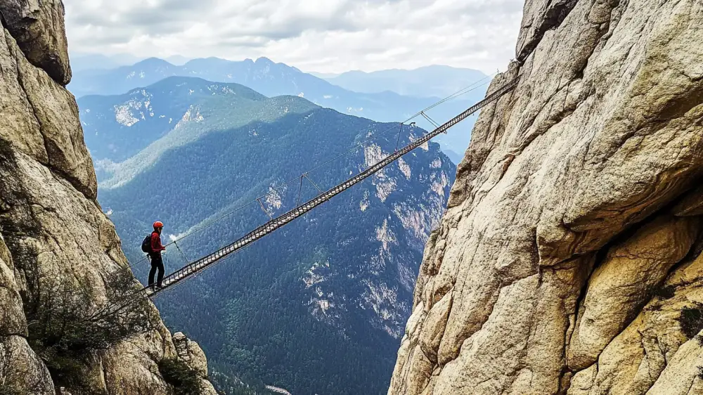 Новый аттракцион в Китае – Небесная лестница Тяньти – быстро стал магнитом для любителей экстрима. Маршрут длиной 168 метров соединяет две скалы на высоте около 1500 метров, предлагая захватывающие видов и адреналиновые впечатления. Построенный в стиле феррата, он оборудован стальными поручнями, подножками и страховочными тросами, что позволяет туристам взбираться по отвесным скалам.