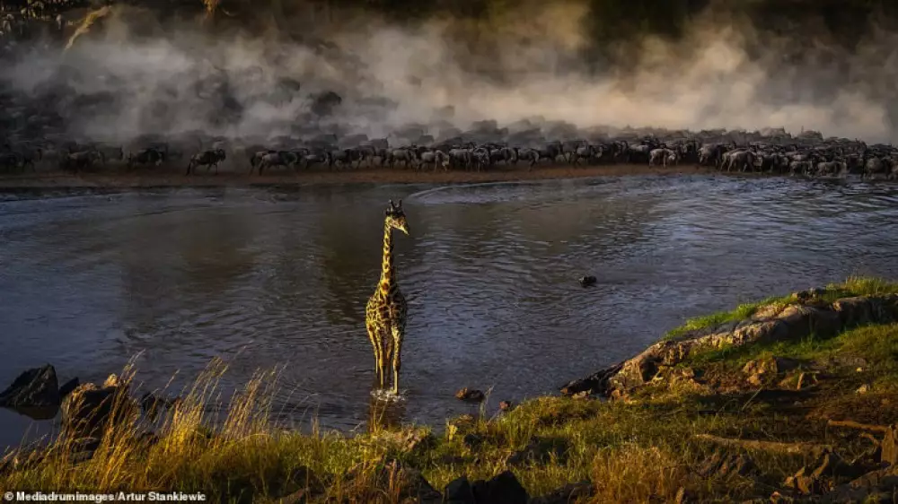 Польский фотограф Артур Станкевич получил второе место в категории "Млекопитающие" за это изображение жирафа в реке Мара во время ежегодной миграции антилоп гну через Северный Серенгети в Танзании.