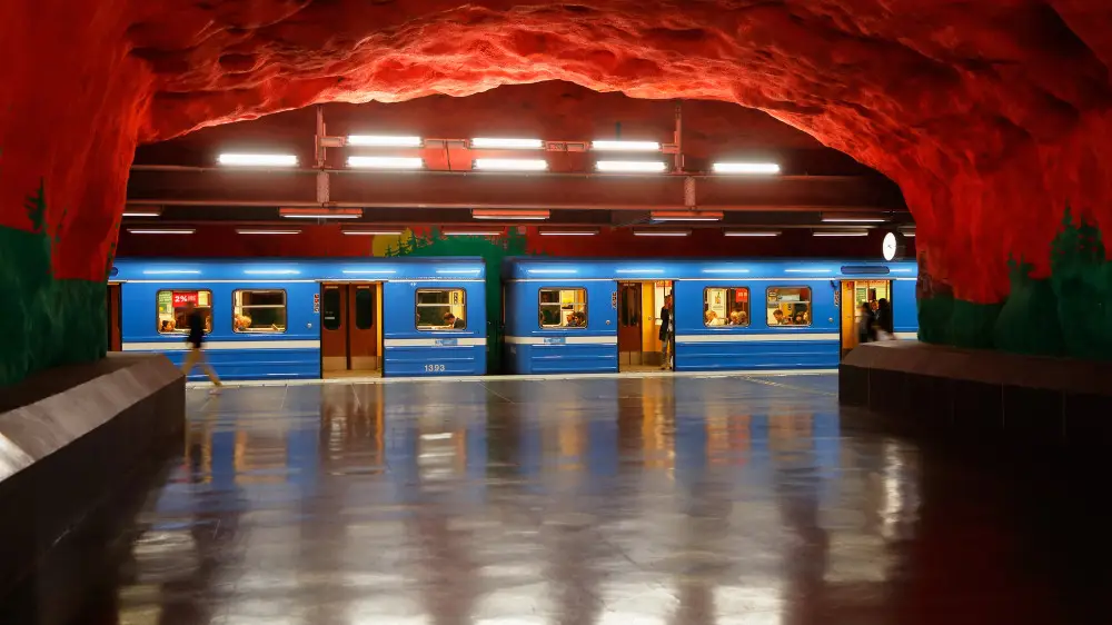 Метро Стокгольма само по себе знаменито в мире как художественная галерея под землей. Начиная с 50-х годов над интерьерами станций трудились 140 художников и оформляли их в своем уникальном стиле. Solna Centrum, открытая в 1975 году, позволяет пассажирам погрузиться в подземную пещеру или скорее рудник на поверхности Марса. Станция выглядит как грубо вырубленная в скале пещера, а стены окрашены ярким красным и зеленым цветами. Может показаться, что это чисто эстетическое решение, но оно несет в себе важный посыл. Тема станции – влияние человека на окружающую среду. Она показывает, как люди отвоевывают пространство у природы.
