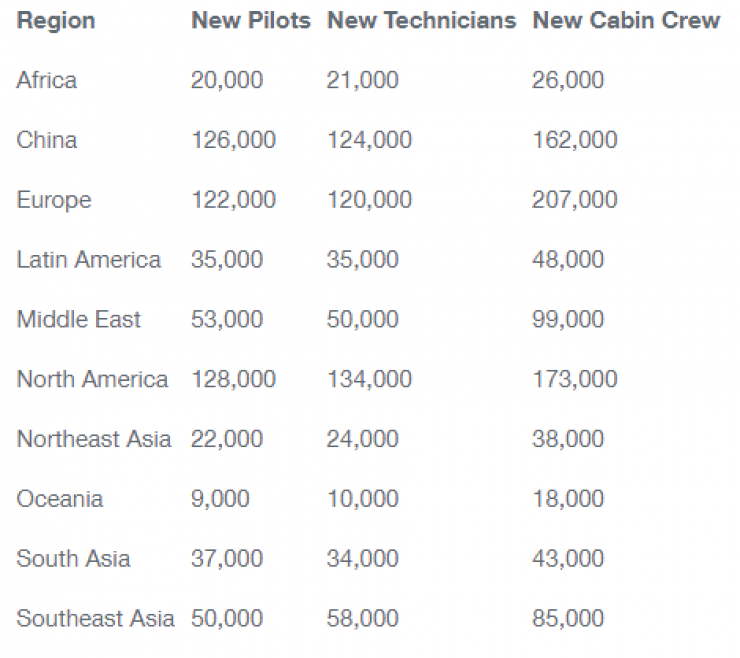 Прогнозируемый спрос на новых пилотов, техников и бортпроводников по всему миру на следующие 20 лет.