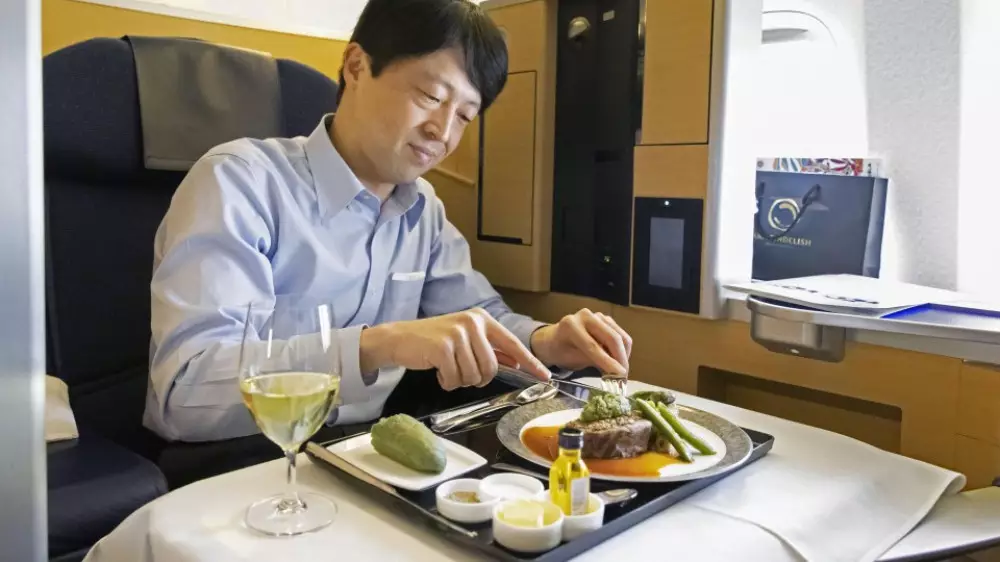 Пассажиры могут выбрать блюда в японском или западном стиле, которые авиакомпания обычно предоставляет в салонах первого класса и бизнес-класса.