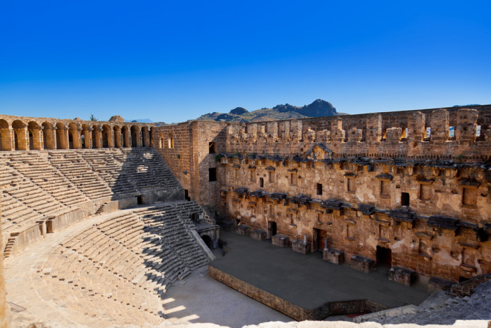 Аспендос. Этот древний греко-римский город находится на юге Турции, в 35 километрах от Анталии. Он был основан еще в 10 веке до нашей эры, сразу после Троянской войны. И с тех пор переходил от одних завоевателей к другим. Главной достопримечательностью города является хорошо сохранившийся римский амфитеатр, который был построен по приказу Марка Аврелия. Он может вместить до 15 000 зрителей и обладает очень хорошей акустикой. Интересно, что до 2008 года на площадке этого амфитеатра проводились различные театральные постановки и музыкальные концерты. Но теперь рядом с ним построили новую площадку и мероприятия проводятся там. Рядом с амфитеатром находятся не менее интересные достопримечательности, такие, например, как Некрополь, в котором можно увидеть высеченные из камня гробницы и саркофаги, древнюю рыночную площадь с храмом нимф, базилику, а также самый большой в Турции римский акведук.