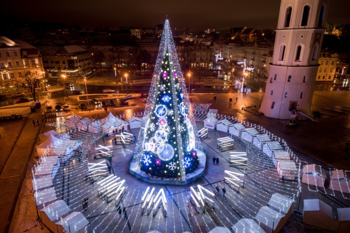 Вильнюс, Литва. Главная елка Литвы зажглась на Кафедральной площади еще 1 декабря. В этом году елка, как и в прошлом, достигает 27 метров в высоту и 50 метров в ширину, занимая все пространство рождественского городка. По словам автора проекта "Рождество в столице" Паулюса Юргутиса, в этом году на оформление из бюджета было получено около 300 000 евро. В прошлом году главная елка Литвы стала самой красивой в Европе. Городская мэрия сообщила, что на ней было 70 000 лампочек, 900 игрушек, а общая площадь композиции составила больше 2500 квадратных метров.
