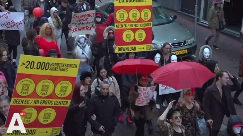 Секс-работники, владельцы бизнеса и жители Де Валлена - района Амстердама, в который входит "квартал красных фонарей", вышли на улицы города и прошли маршем до мэрии в знак протеста против предложения перенести популярное туристическое место из центра города в другой район.