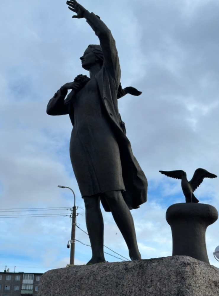 Посмотрели актюбинки на памятник «Ждущей», это памятник женщине, ждущей своего моряка. Его установили в 2012 году. Огромный памятник солдату в плащ–палатке люди ласково называют «Алеша». Высота солдата - 35,5 метра, а общая высота мемориала – 42 метра. Сопка Зеленый мыс, где находится мемориал, выше уровня Кольского залива на 173 метра!