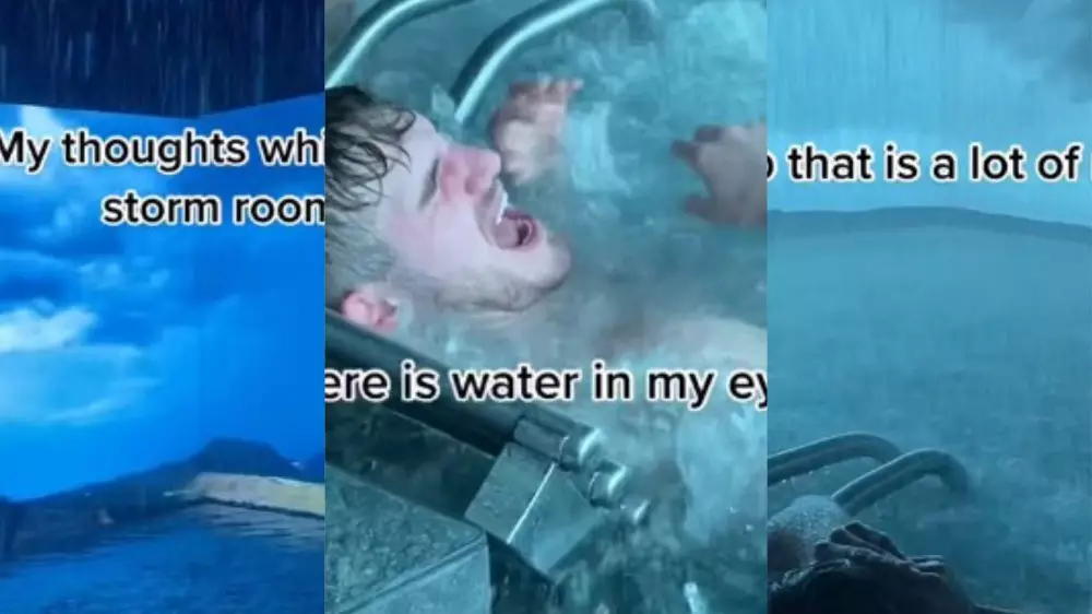 В ролике можно увидеть, как отдыхающих в бассейне поливает водой специальная разбрызгивающая система, "заменяя" собой проливной дождь. Картину дополняют вспышки молнии и мрачные тучи.