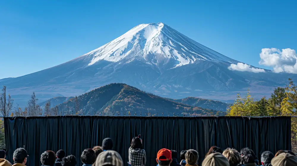"Это прискорбно, что нам пришлось принять такие меры", – заявил местный чиновник, когда городской совет решил закрыть самый популярный вид на Фудзи с помощью 20-метрового черного экрана, установленного 21 мая.