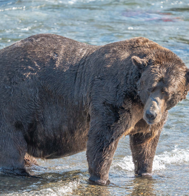 Сообщается, что крупная мама-медведица впервые была завезена на реку Брукс еще детенышем в 2005 году. С тех пор она живет в национальном парке, а также является одной из самых крупных самок среди сородичей. Грейзер – отличный рыболов, ей удается добывать рыбу практически на всех участках реки: как в устье, так и на водопадах.