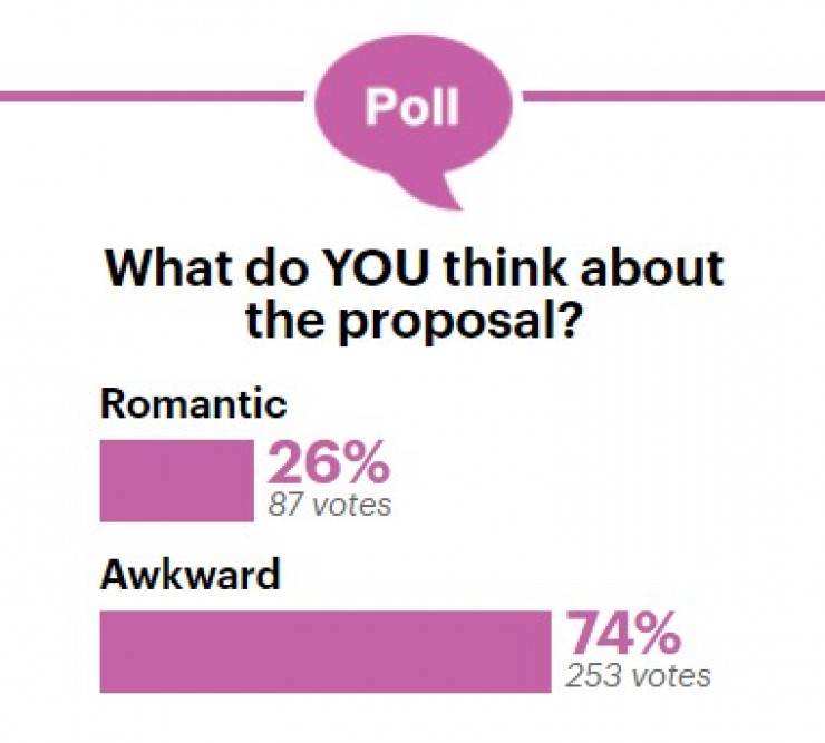 Издание организовало онлайн-опрос среди читателей: считают они предложение на видео романтичным или неловким. С подавляющим преимуществом - 74 процента голосов - победил второй вариант.