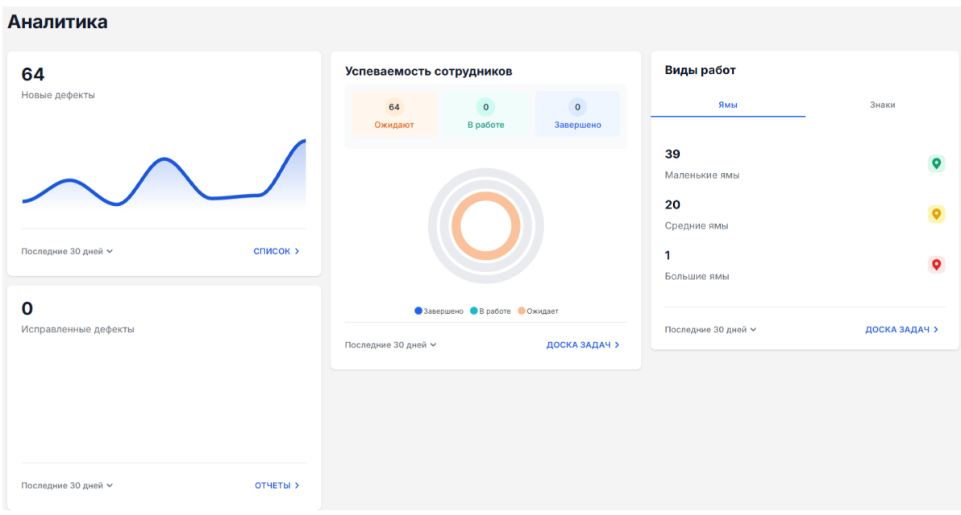 Помимо этого, система формирует аналитические отчёты. Например, сколько дефектов было обнаружено за определённый период, сколько из них уже устранено и сколько остаются без ремонта.