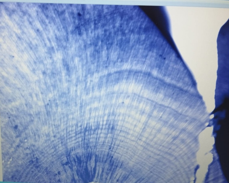 Срез зуба тюленя под микроскопом.