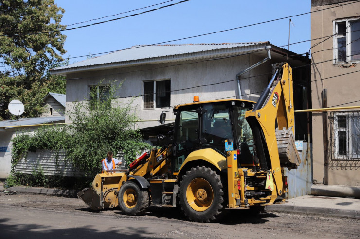Здесь одновременно делают сразу несколько видов работ: снятие дорожного полотна и прокладку труб, а также замену и отрихтовку бордюров.